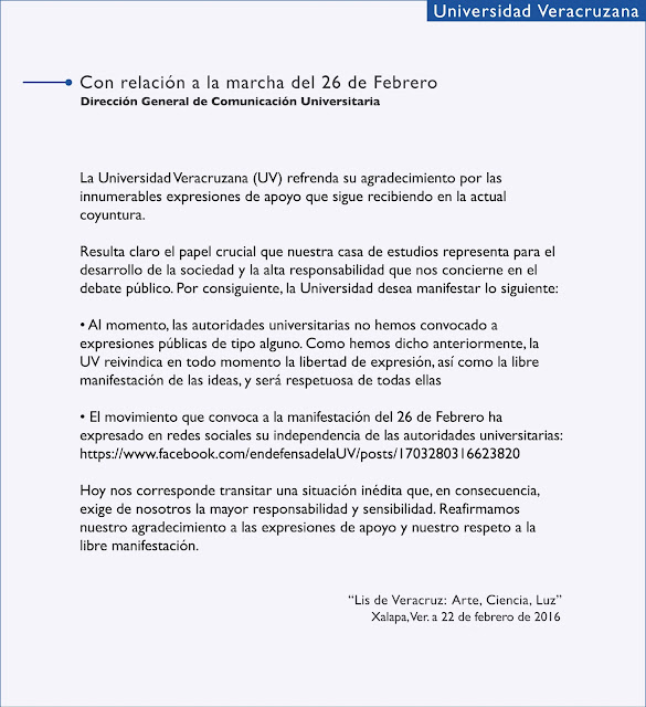 A través de un comunicado, la Universidad Veracruzana se deslindó de la marcha convocada el próximo 26 de febrero por parte de un grupo en redes sociales con la etiqueta #EnDefensaDeLaUV.