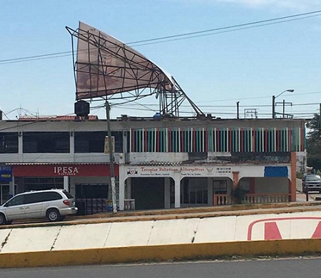 Alrededor de las 13:00 horas, un anuncio espectacular propiedad de una farmacia ubicada en la esquina de las calles Hidalgo y José Arenas, se desprendió de unos 8 metros de altura, causando daños a los medallones de una camioneta en color negro, estacionada y el taxi número 3119 de esta localidad, que circulaba por la avenida Hidalgo.