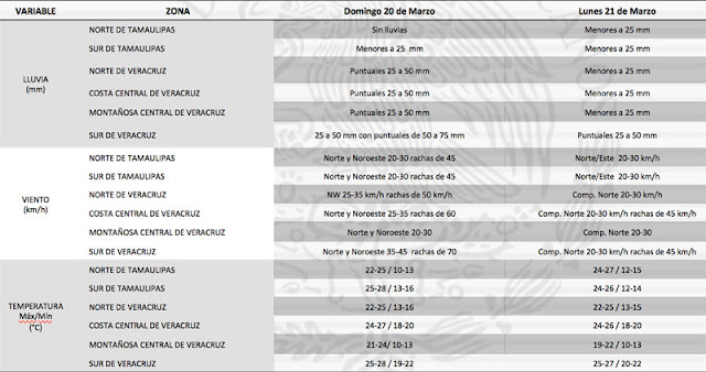 El viento será de componente Norte con velocidades de 25 a 35 km/h y rachas de hasta 70 km/h el resto del día domingo, especialmente en la porción costera central del Estado de Veracruz; mientras que en Tamaulipas y el resto del primero se espera con velocidades similares y rachas en la costa de hasta 50 km/h, así como marcado descenso de la temperatura durante el resto del domingo y lunes.