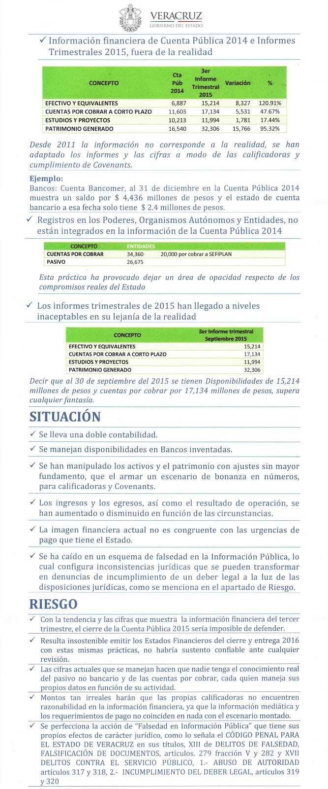 Informes internos del Gobierno del Estado, elaborados como preparativos de la entrega-recepción para el cambio de gobierno de la Secretaría de Finanzas y Planeación (Sefiplan), mismos que poseemos como respaldo, reconocen la falsificación de la contabilidad gubernamental en la gestión de Javier Duarte con el objeto de engañar a calificadoras y a los veracruzanos, mostrando una situación financiera ficticia.