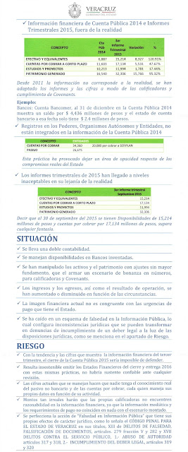 Un reporte relativo a la información financiera de la Cuenta Pública 2014 y de los informes trimestrales de 2015, alerta de los riesgos penales por los delitos en que han incurrido y sostiene que “desde 2011 la información no corresponde a la realidad, se han adaptado los informes y las cifras a modo de las calificadoras y cumplimiento de covenants (cláusulas o compromisos).