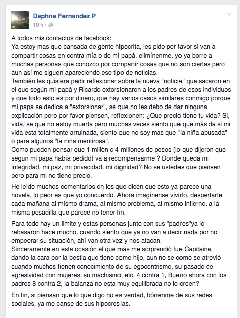 "También les quisiera pedir reflexionar sobre la nueva "noticia" que sacaron en el que según mi papá y Ricardo extorsionaron a los padres de esos individuos y que todo esto es por dinero, que hay varios casos similares conmigo porque mi papa se dedica a "extorsionar", se que no les debo de dar ninguna explicación pero por favor piensen, reflexionen: ¿Que precio tiene tu vida? Si, vida, se que no estoy muerta pero muchas veces siento que que más da si mi vida esta totalmente arruinada, siento que no soy mas que "la niña abusada" o para algunos "la niña mentirosa".