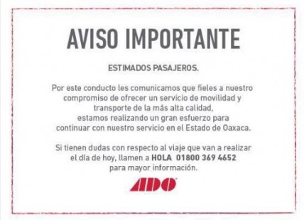 La empresa Autobuses de Oriente (ADO) confirmó la cancelación de todas sus corridas con dirección al estado de Oaxaca, debido a la situación de bloqueos en las vialidades en aquella entidad por parte de la Coordinadora Nacional de Trabajadores de la Educación.