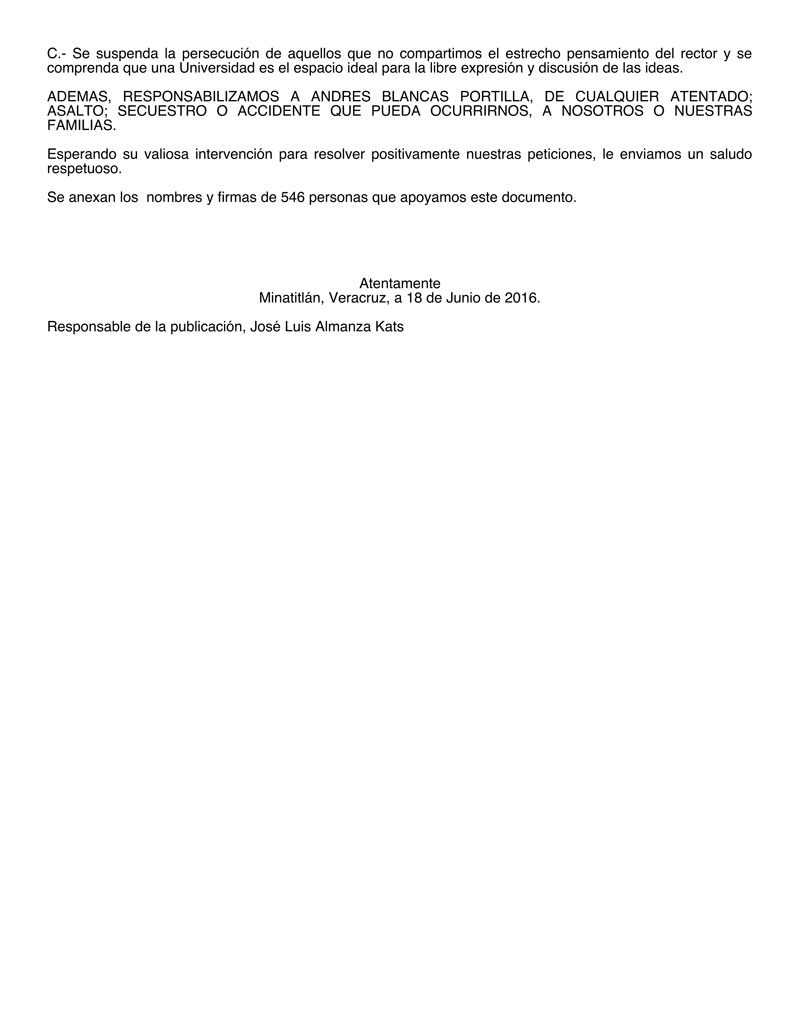 En dicho desplegado señalan que a los directores se les ordenó cometer delitos electorales, los cuales se negaron a hacer y en consecuencia están siendo removidos de sus cargos en la sede de Minatitlán.