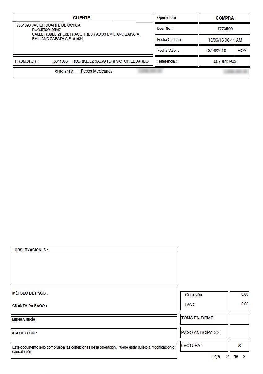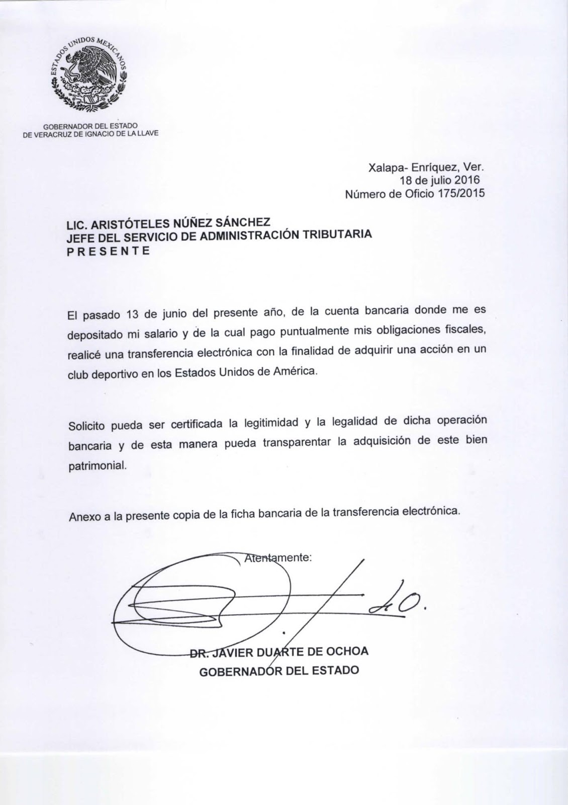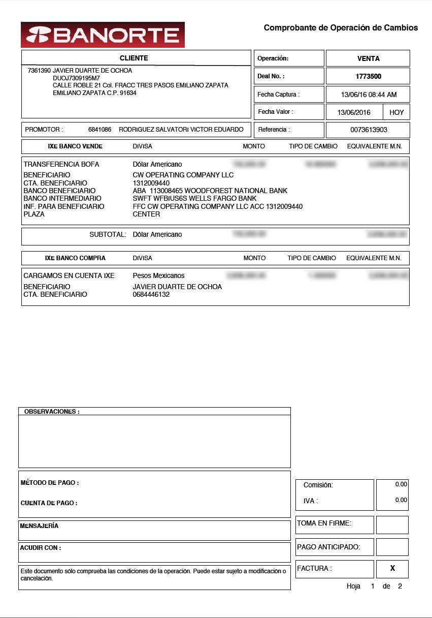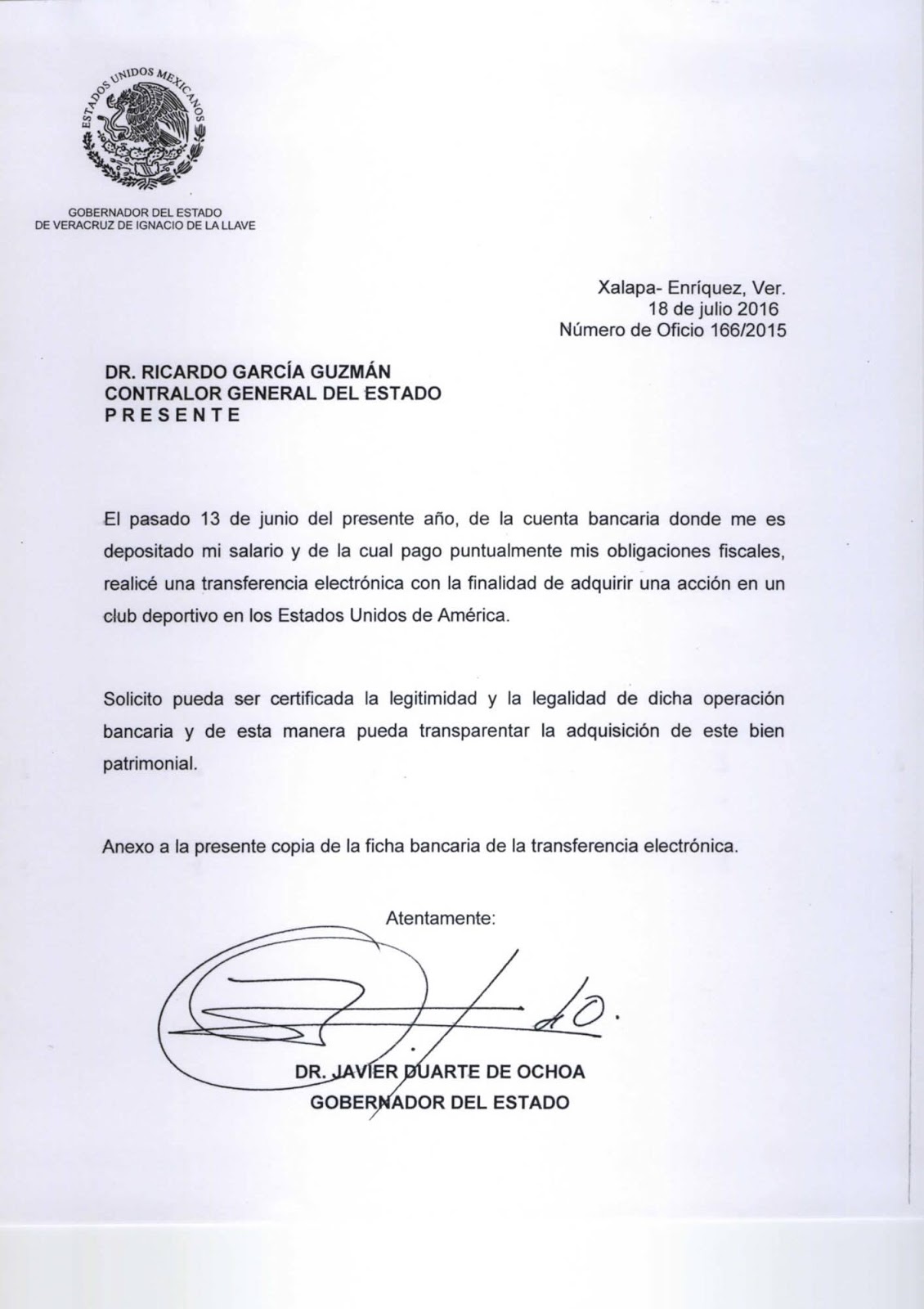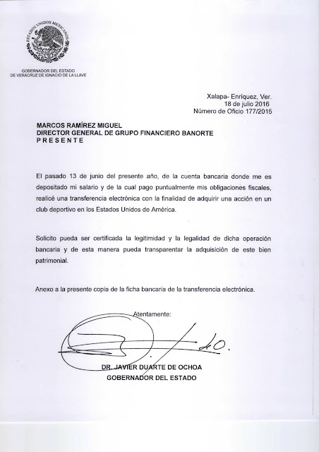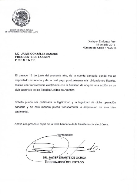 En documentos enviados a autoridades fiscales y bancarias, el Gobernador Javier Duarte de Ochoa pidió que se certifique la legitimidad de una transacción realizada el pasado 13 de junio, cuando adquirió una membresía en un club deportivo de Estados Unidos de América.