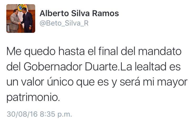 A través de su cuenta de Twitter, el coordinador de comunicación social Alberto Silva Ramos, desmintió que se irá de la coordinación con el siguiente texto: “Me quedo hasta el final del mandato del Gobernador Duarte. La lealtad es un valor único que es y será mi mayor patrimonio”. Y es que algunas columnas de la tarde de este martes, asentaron como un error el regreso a la coordinación del tuxpeño. ¿Un error acompañar hasta el final al amigo, por encima de cualquier vicisitud? ¿Los integrantes de un equipo deben estar mientras están en las mieles del poder? Algo hay de cierto, cuando el columnista anota que es lamentable que Silva Ramos regrese a San Lázaro desgastado y con poca presencia en su distrito, por acompañar al Gobernador Duarte al final de su sexenio.
