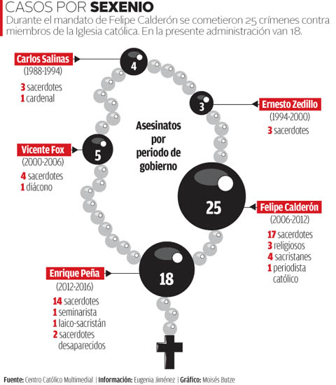 Además, dijo, en los asesinatos de sacerdotes se registra un incremento en la modalidad de secuestro, tortura y ejecución. Algunos de los homicidios en el actual sexenio son: