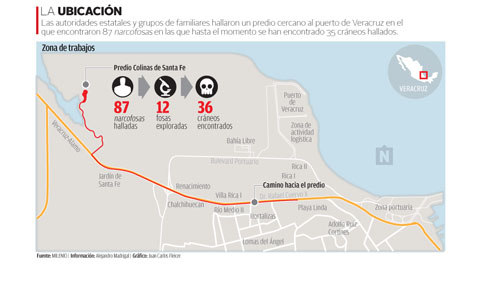 Rosalía, Erika, Celia y Perla recorren todos los días 4 kilómetros en la batea de una camioneta 4X4 por un camino de terracería para llegar a lo que llaman El Infierno. Estas mujeres trabajan bajo un sol de 40 grados y en un predio cercano a la colonia Colinas de Santa Fe, en los límites del Puerto de Veracruz y La Antigua, donde hallaron 87 narcofosas en las que pudieran estar enterrados al menos 250 cadáveres.