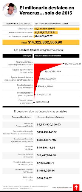 La auditoría de la Cuenta Pública 2015 de Veracruz descubrió que el año pasado se desviaron más de 400 millones de pesos con este modus operandi, que coincide plenamente con el utilizado en 2012, 2013 y 2014 para desaparecer casi mil millones como lo documentó Animal Político en un reportaje publicado en mayo pasado.