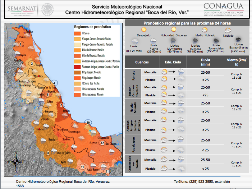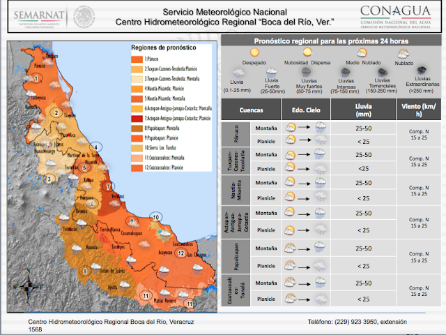 Pronóstico Regional a 24 h: Persistirá la interacción del canal de baja presión en el occidente del Golfo de México con el calentamiento diurno y el forzamiento orográfico que favorecerán las condiciones para lluvias y tormentas eléctricas vespertinas a nocturnas en zonas montañosas y nocturnas a matutinas en planicies y costa de Veracruz, previéndose intervalos de chubascos (5.1 a 25 mm) y tormentas puntuales fuertes (25 a 50 mm), especialmente en regiones montañosas, esperándose en planicies y costa lluvias con intervalos de chubascos (5.1 a 25 mm). El viento será del Norte y Noreste de 15 a 25 km/h. La temperatura diurna favorecerá un ambiente caluroso a muy caluroso en planicies y costa, mientras que en regiones montañosas se mantendrá templado a cálido; durante la noche y madrugada permanecerá el ambiente frío en zonas serranas.
