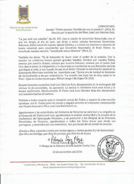 Mediando un comunicado firmado por monseñor Fidencio López Plaza, obispo de la Diócesis de San Andrés Tuxtla, se confirmó la aparición del sacerdote José Luis Sánchez Ruiz, desaparecido desde el viernes pasado.