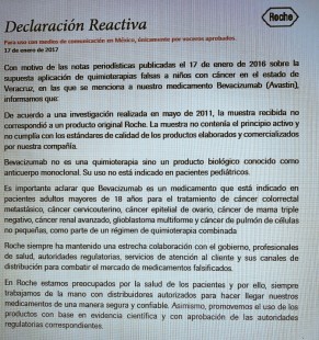 En un comunicado, el Laboratorio Roche desmintió al Gobierno de Veracruz sobre el supuesto medicamento falso que se habría aplicado a niños con cáncer durante los gobiernos de Fidel Herrera y Javier Duarte: “Bevacizumab no es una quimioterapia sino un producto biológico conocido como anticuerpo monoclodar. Su uso no está indicado en pacientes pediátricos”.