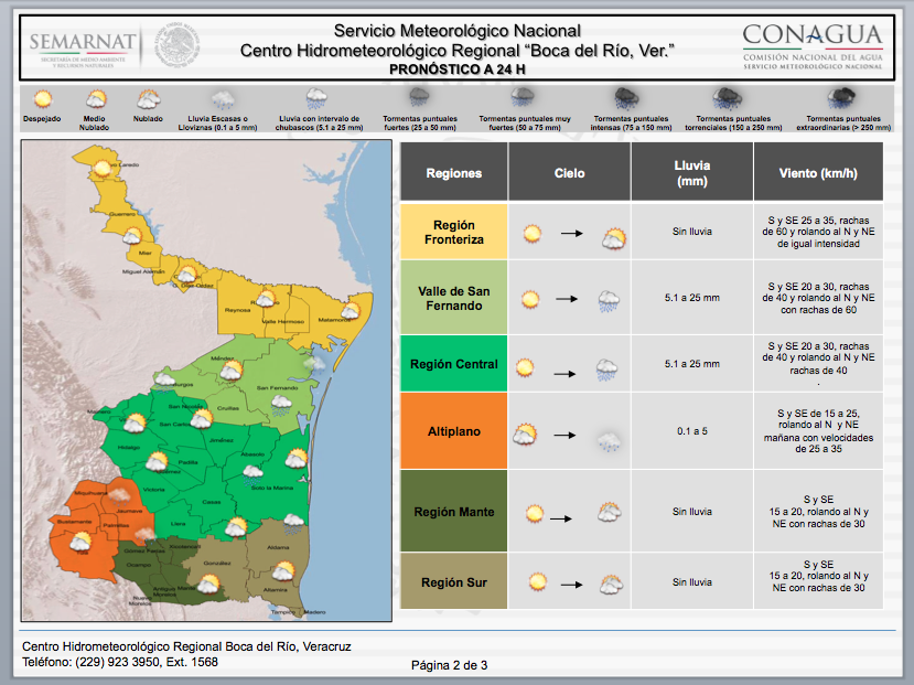 Síntesis: Continuará presentándose ambiente estable y vientos del Sur y Sureste fuertes en Tamaulipas así como en la región montañosa central y sur de Veracruz por la mañana, situación que cambiará debido al frente frío No. 25., y masa de aire frío asociada que afectarán a ambas entidades.