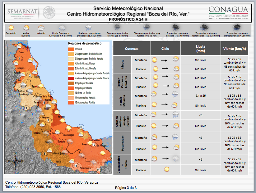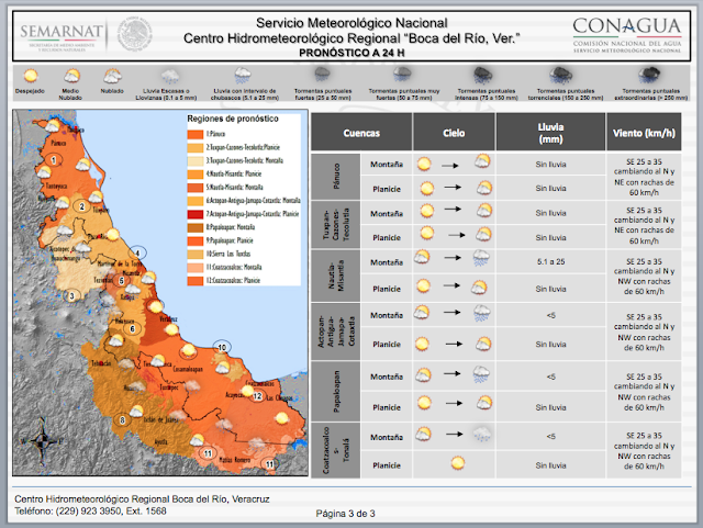 Pronóstico Regional a 24 h: El frente frío No. 25., localizado en los límites entre Nuevo León y Tamaulipas, recorrerá la vertiente oriental del país, en su desplazamiento hacia el sureste ocasionará aumento de nublados y del potencial lluvias sobre la región de pronóstico esta tarde, previéndose intervalos de chubascos aislados en zonas montañosas de Tamaulipas y Veracruz. La masa de aire frío asociado provocará “evento de Norte” con rachas de 50 a 60 km/h en Tamaulipas, efectos que se propagarán hacia la entidad veracruzana durante el día jueves, donde, además de descenso de temperatura con nieblas y neblinas en las zonas antes mencionadas.