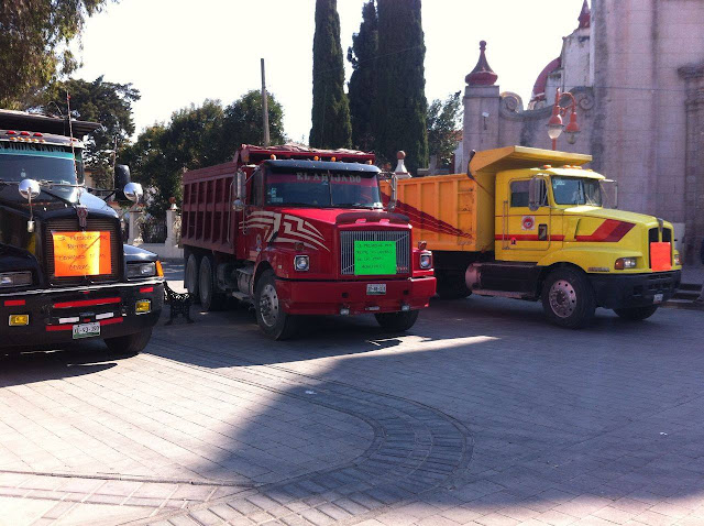 Un numeroso grupo de trabajadores materialistas apostaron sus transportes en la explanada frente a palacio municipal para exigir al alcalde Miguel Sebastián Taboada Ortiz que pare sus atropellos y abusos de autoridad al amparo de su amistad con el senador José Yunes Zorrilla.