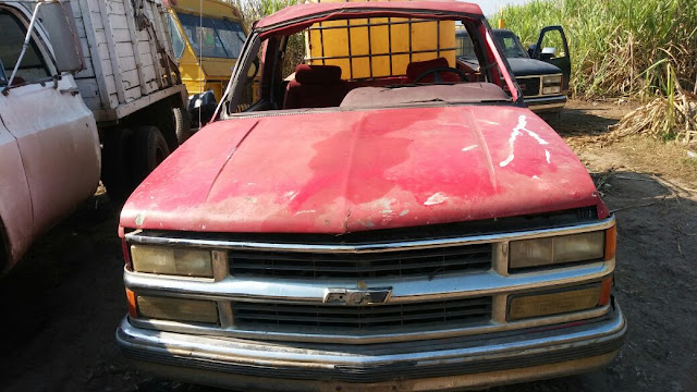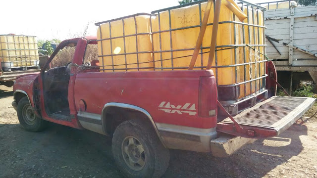 Otra unidad es una camioneta Chevrolet roja sin placas, sin puerta y sin parabrisas izquierda del lado del conductor y 3 bidones.