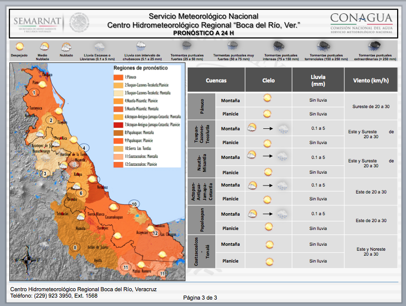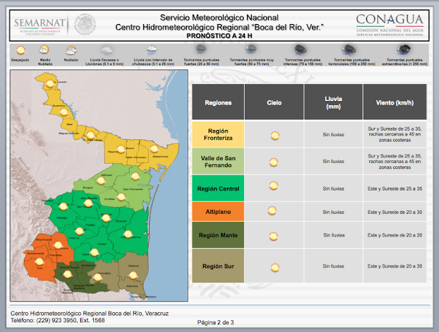 Pronóstico Regional a 24 h: Se prevé que persista la circulación anticiclónica sobre el golfo de México; misma que, generara la entrada de aire marítimo tropical hacia la vertiente oriental del país; y con ello, cielo despejado a medio nublado sobre Tamaulipas y Veracruz, así como un potencial de lluvias limitado en ambos Estados; sin embargo, debido al calentamiento diurno y a las condiciones orográficas, se esperan algunas lloviznas o lluvias escasas (menores a 5 mm) especialmente en zonas montañosas de la región. En cuanto al viento, se mantendrá del Sur y Sureste en Tamaulipas con velocidades de 25 a 35 km/h presentando rachas cercanas a 45 km/h durante la tarde y noches en zonas costeras, mientras que en Veracruz, será del Este y Sureste con velocidades de 20 a 30 km/h. Se prevé que la temperatura continúe ocasionando ambiente caluroso a lo largo de la región de pronóstico durante el día, esperando ambiente frío a fresco por la noche, especialmente en zonas montañosas.