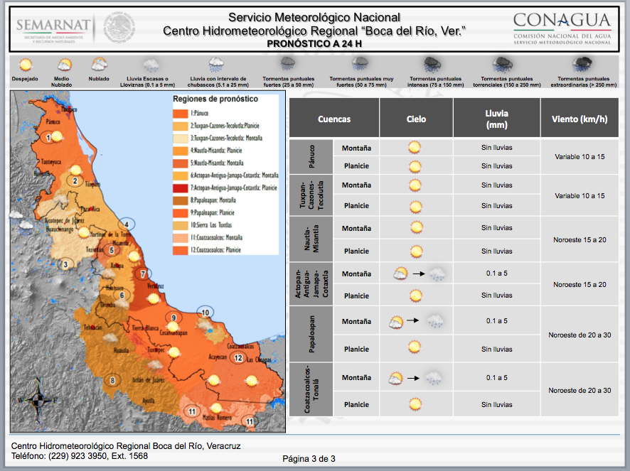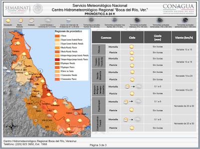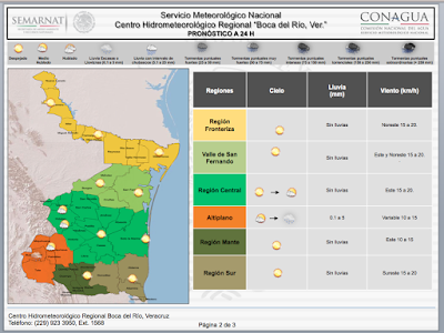 Pronóstico Regional a 24 h: Se prevé la disminución de la nubosidad sobre la región de pronóstico así como del potencial de lluvias, sin embargo, no se descartan lloviznas aisladas sobre zonas montañosas de Tamaulipas y Veracruz, además de nieblas y neblinas vespertinas a nocturnas.