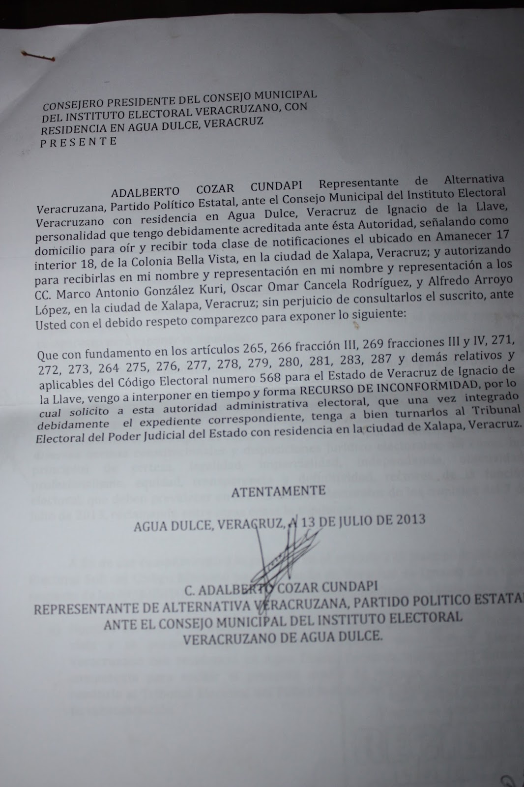 Los documentos de la impugnación presentada por AVE en el 2013, por la "sumatoria incorrecta y deliberada" de votos a favor del candidato del PRI, Daniel Martínez González.