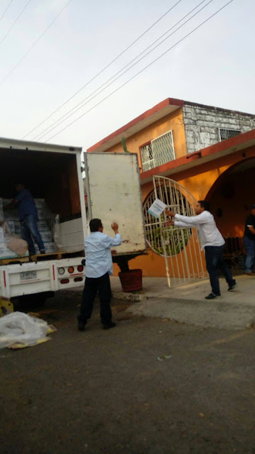 En las fotografías se muestra una camioneta de carga de tres toneladas con personal de la Sedesol descargando despensas del programa del gobernador Miguel Ángel Yunes Linares al domicilio particular de Salomón Palmeros, quien busca la regidora primera en la próxima elección municipal del municipio de Puente Nacional.