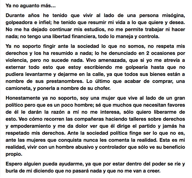No es la primera vez que Guille Alvarado denuncia que el exlíder perredista la golpea; el pasado 24 de septiembre de 2016, también en sus redes sociales, subió una carta que después borró y argumentó que su cuenta había sido hackeada, y donde denunciaba vivir con una persona “misógina y golpeadora”.