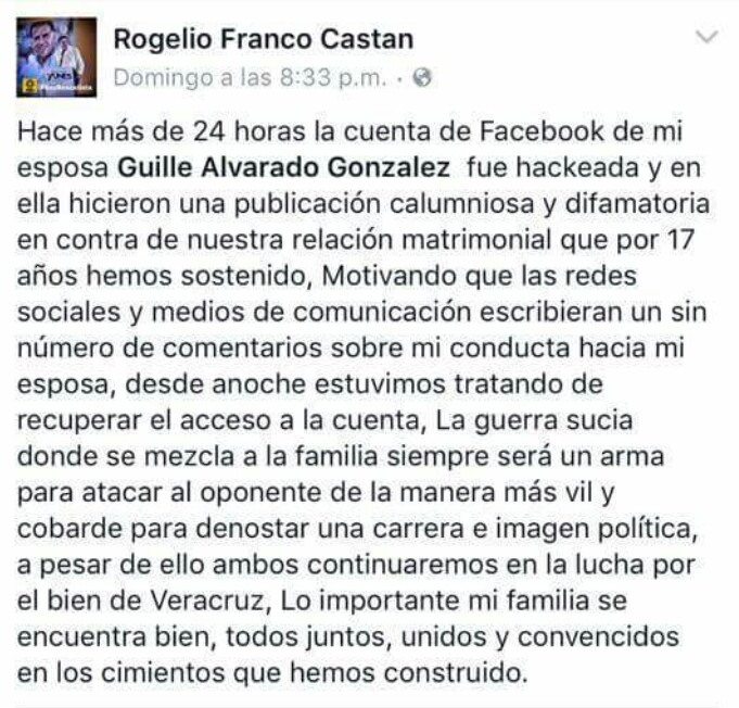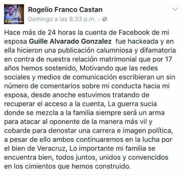Este sábado, la esposa del secretario de Gobierno de Veracruz, Rogelio Franco Castán, denunció en su cuenta de Facebook “abusos y maltratos”, e hizo acompañar su publicación con dos fotos donde se ve con un ojo morado.