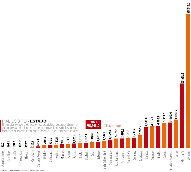 El mayor monto de los recursos desviados se presentó en cinco estados que concentran 56 por ciento de los 98 mil 911 millones de pesos que no pudieron comprobar los gobiernos estatales. En esta lista se encuentran el Estado de México, Jalisco, Michoacán, Oaxaca y el emblemático caso de Veracruz.