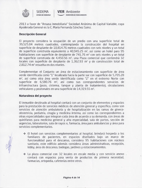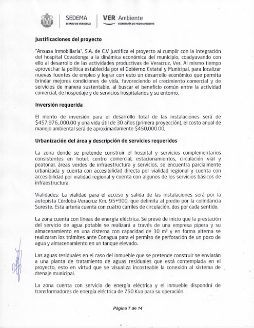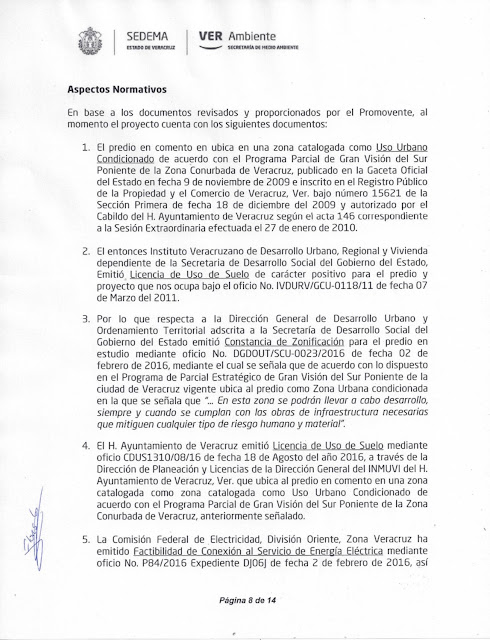 También a la redacción de AGN Veracruz, llegó el Manifiesto de Impacto Ambiental (MIA) que la inmobiliaria ANSASA Inmobiliaria de S.A de C.V presentó a través de sus apoderados legales, María Fernanda Sánchez Sainz y Antonio Sánchez Sainz [la primera de la inmobiliaria y el sujeto por parte del “corporativo”] y que estos mismos presentaron ante la Secretaría del Medio Ambiente (SEDEMA). El supuesto proyecto de Manifestación de Impacto Ambiental (MIA) la cual debería de contener la evaluación del impacto ambiental, las etapas de este proceso en el que se basaron, el flujograma del proceso de evaluación, la guía para la elaboración y los datos generales de dicho proyecto, no los contiene. http://www.cmic.org.mx/comisiones/Sectoriales/medioambiente/Gu%C3%ADas%20SEMARNAT/MIA,%20Informe%20Preventivo%20y%20DTU/MIA%20Particular/g_vias_generales.pdf