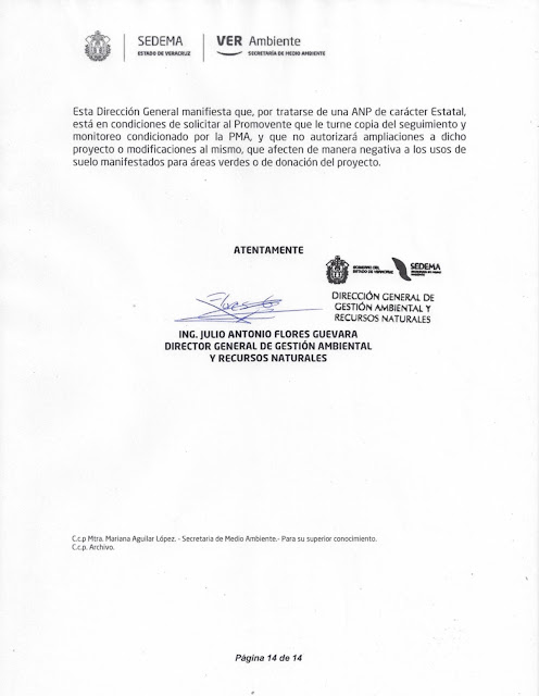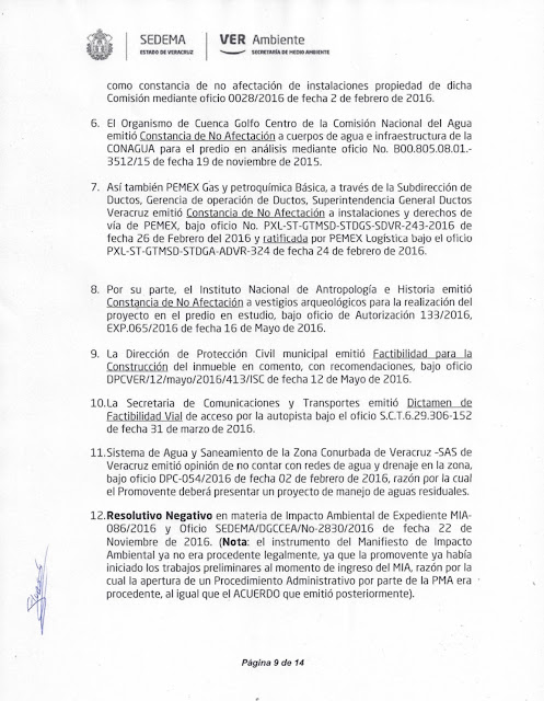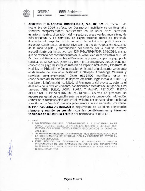 AGN Veracruz, tiene en su poder los documentos tanto de la negativa de la SEDEMA como también la autorización que ésta dependencia le otorga a ANSASA S.A. de C.V. en donde le permite continuar con los trabajos de relleno del Área Protegida de Tembladeras, sepultando con dicha acción a tanto flora y fauna que subsisten en la zona, originando un verdadero ecocidio en el lugar. Es una foja de 14 páginas en donde le justifica la dependencia a la inmobiliaria la continuidad de los trabajos, indicándole que solo pagará una multa por haber entrado [al parecer la matanza de flora y fauna no le interesa] indebidamente al lugar.