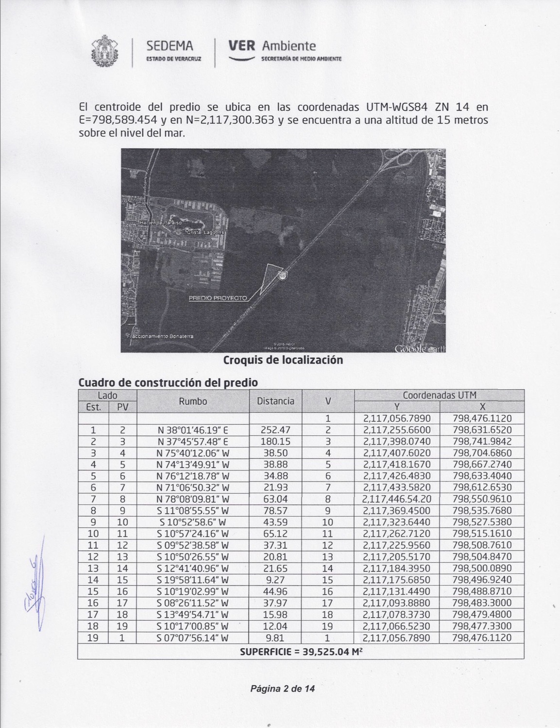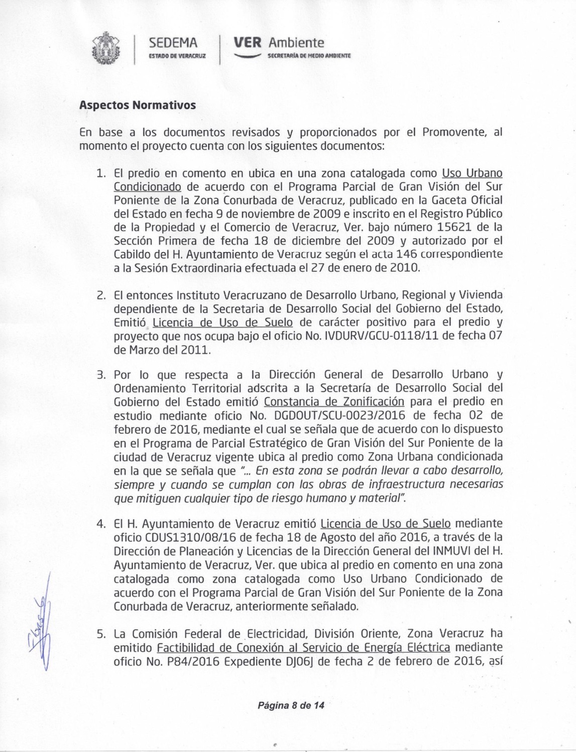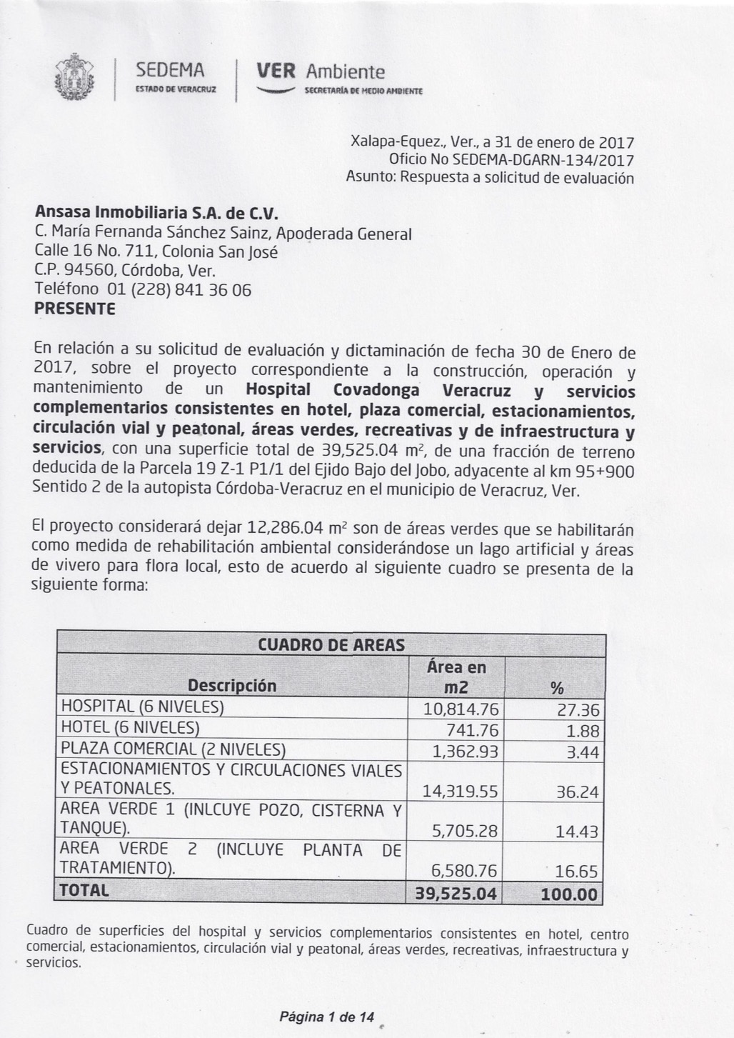 “En relación a su solicitud de evaluación y dictaminación de fecha 30 de enero del 2017 sobre el proyecto correspondiente a la construcción, operación y mantenimiento de un Hospital Covadonga Veracruz y servicios complementarios consistentes en hotel, plaza comercial, estacionamientos, circulación vial y peatonal, áreas verdes, recreativas y de infraestructura y servicios, con una superficie total de 39’525.04 m2 de una fracción de terreno deducida de la parcela 19-Z-1 P1/1 del ejido Bajo del Jobo, adyacente al km 95+900 sentido 2 de la autopista Córdoba-Veracruz en el municipio de Veracruz, Ver.”