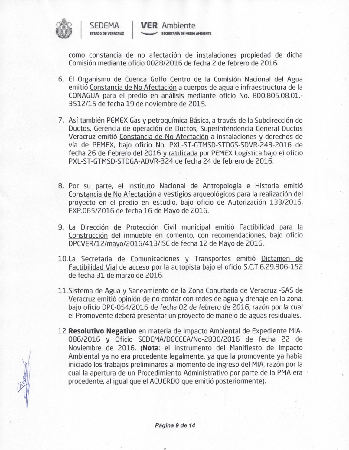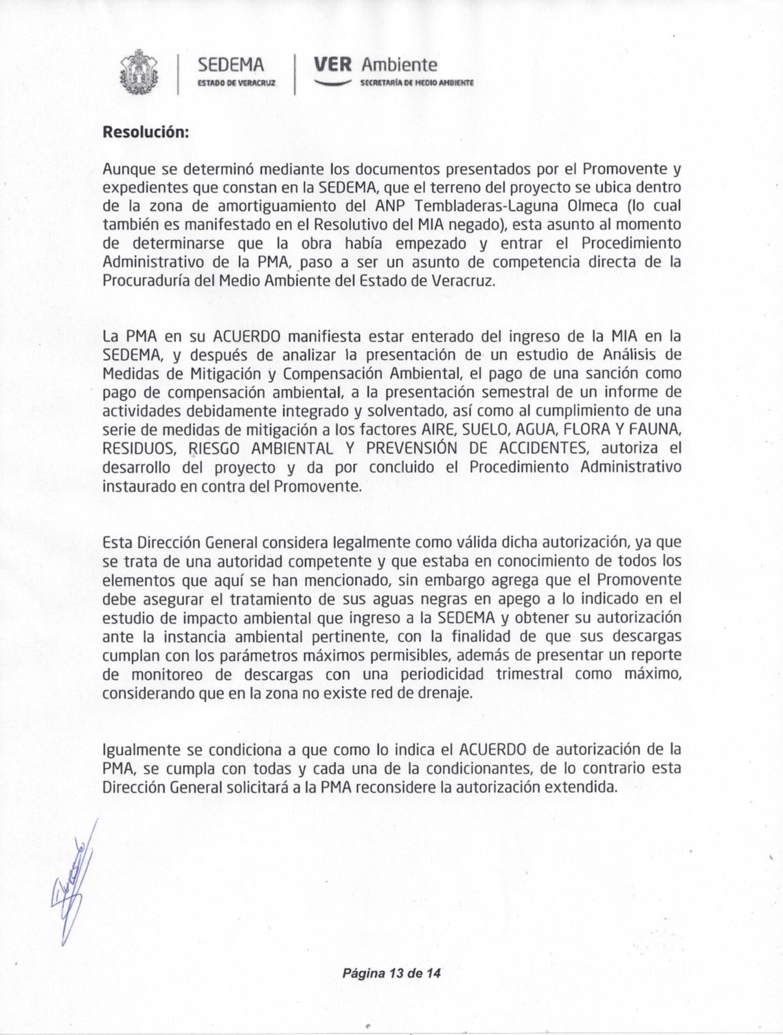 “Aunque se determinó mediante los documentos presentados por el promovente y expedientes que constan en la SEDEMA, que el terreno del proyecto se ubica dentro de la zona de amortiguamiento del ANP Tembladeras-Laguna Olmeca (lo cual también es manifestado en el Resolutivo del MIA negado), esta asunto por el momento de determinarse que la obra había empezado y entrar el Procedimiento Administrativo de la PMA, pasó a ser un asunto de competencia directa de la Procuraduría del Medio Ambiente del estado de Veracruz (…) La PMA en su ACUERDO manifiesta estar enterado del ingreso de la MIA en la SEDEMA, y después de analizar la presentación de un estudio de Análisis de Medidas de Mitigación y Compensación Ambiental, el paso de una sanción como pago de compensación ambiental, a la presentación semestral del informe actividades debidamente integrado y solventado, así como al cumplimiento de una serie de medidas de mitigación a los factores de AIRE, SUELO, AGUA, FLORA Y FAUNA, RESIDUOS, RIESGO AMBIENTAL Y PREVENSIÓN DE ACCIDENTES, autoriza el desarrollo del proyecto y da por concluido el Procedimiento Administrativo Instaurado en contra del Promovente”