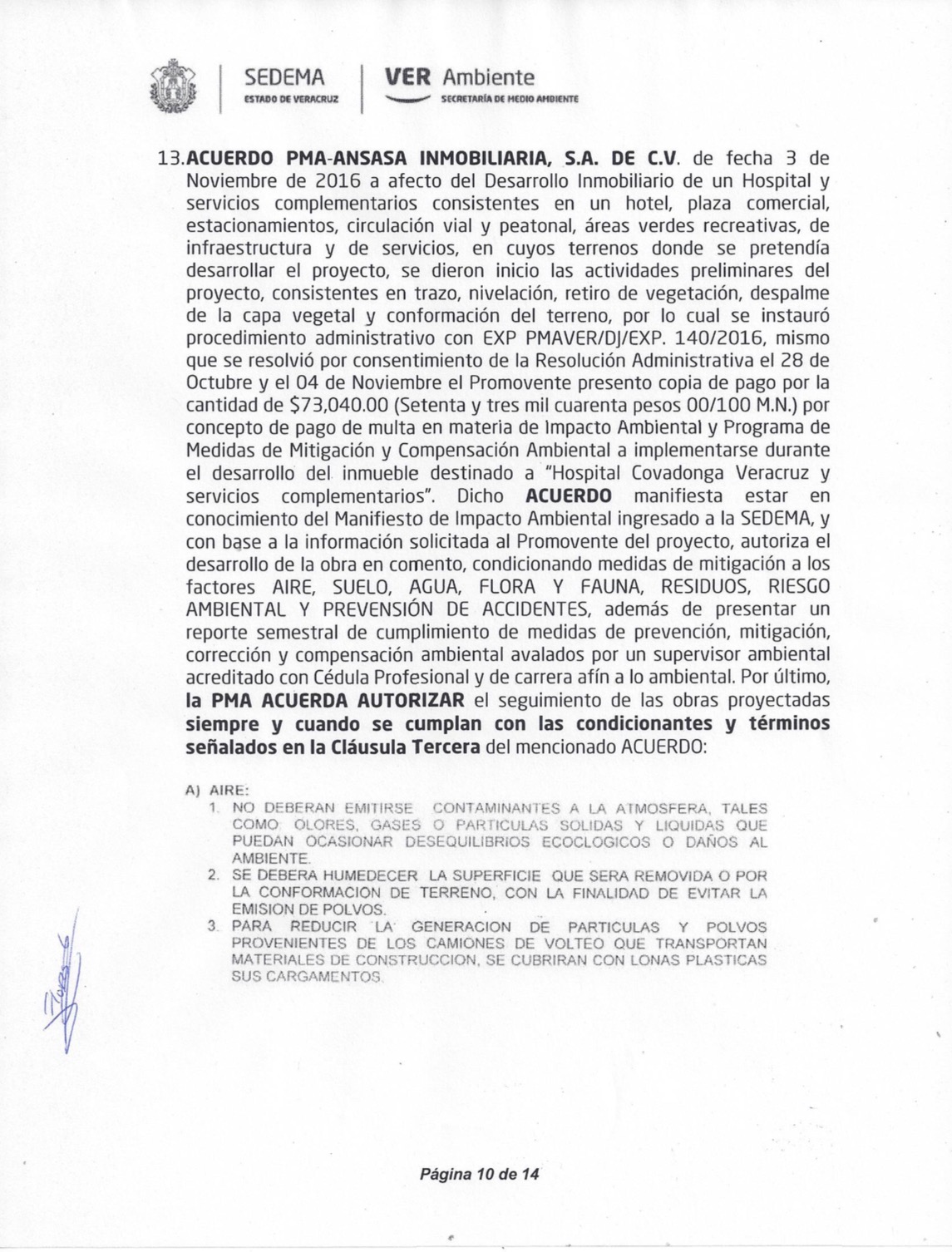 Bajo el oficio SEDEMA/DGCCEA/ número 2830/2016, la Secretaría de Medio Ambiente del gobierno del estado con fecha del 22 de noviembre del 2016, negó a la empresa inmobiliaria la pretensión de construir en dicho humedal, pero dos meses después de este acto, le gira otro oficio dirigido a María Fernanda Sánchez Sainz, apoderada legal de la empresa ANSASA Inmobiliaria S.A. de C.V., ubicada en la calle 16 número 711 en la colonia San José en el municipio de Córdoba, Veracruz con el número telefónico (228) 8413606; oficio SEDEMA-DGARN-134/2017 con fecha del 31 de enero del 2017 en donde le autoriza el desarrollo del proyecto y dicho documento acepta que la MIA-086/2016 en su momento le fue negada, pero al haber iniciado la obra la empresa constructora, se le impone únicamente una multa para compensar el agravio y se procede a permitirle que continúe con los trabajos que la constructora establezca. El documento se encuentra firmado por Julio Antonio Flores Guevara, director general de Gestión Ambiental y Recursos Naturales, con el sello de la dependencia.
