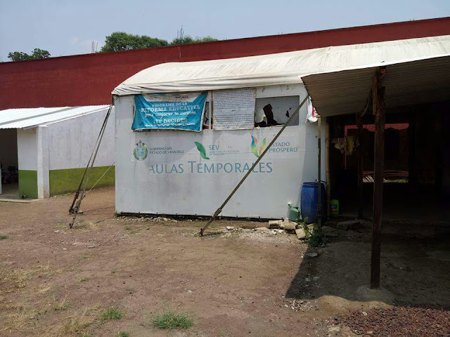 Con aulas temporales y lonas de gobierno, así trabaja esta escuela en la congregación Tapachapan, del municipio de Coatepec, a 10 minutos del centro histórico de la ciudad. En precarias condiciones toman clases los alumnos de la telesecundaria "Niños Héroes", pese a la temporada de lluvias que se ha registrado en las últimas semanas, y que pone en riesgo sus vidas.