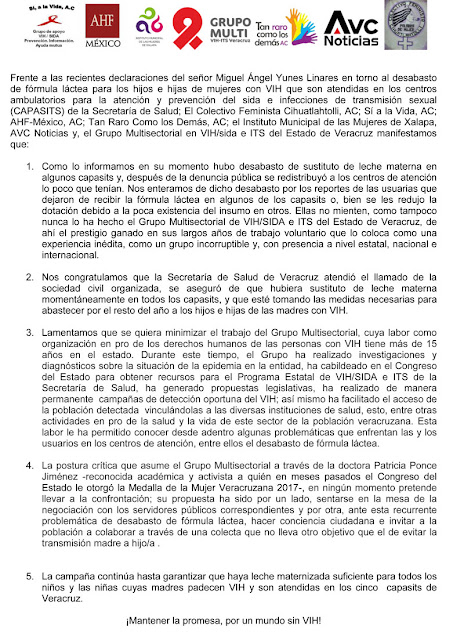 Frente a las recientes declaraciones del señor Miguel Ángel Yunes Linares en torno al desabasto de fórmula láctea para los hijos e hijas de mujeres con VIH que son atendidas en los centros ambulatorios para la atención y prevención del sida e infecciones de transmisión sexual (CAPASITS) de la Secretaría de Salud; El Colectivo Feminista Cihuatlahtolli, AC; Sí a la Vida, AC; AHF-México, AC; Tan Raro Como los Demás, AC; el Instituto Municipal de las Mujeres de Xalapa, AVC Noticias y, el Grupo Multisectorial en VIH/sida e ITS del Estado de Veracruz manifestamos que: