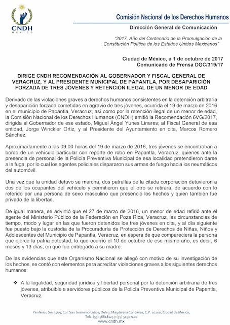 Derivado de las violaciones graves a derechos humanos consistentes en la detención arbitraria y desaparición forzada cometidas en agravio de tres jóvenes, ocurrida el 19 de marzo de 2016 en el municipio de Papantla, Veracruz, así como por la retención ilegal de un menor de edad, la Comisión Nacional de los Derechos Humanos (CNDH) emitió la Recomendación 6VG/2017, dirigida al Gobernador de ese estado, Miguel Ángel Yunes Linares; al Fiscal General de esa entidad, Jorge Winckler Ortiz, y al Presidente del Ayuntamiento en cita, Marcos Romero Sánchez.
