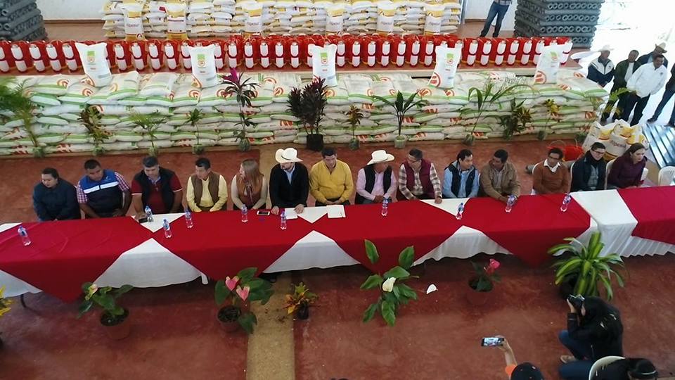 Presidieron la dotación de paquetes de insumos agrícolas a campesinos del municipio de Acayucan, José Ángel Carrera Contreras, presidente de la UPROM, la licenciada Adriana Verde Osorio de la Red Nacional de Mujeres Empresarias, el dirigente regional de la.CNC, Celestino Gómez Carmona y el presidente municipal.Cuitlahuac Condado Escamilla.