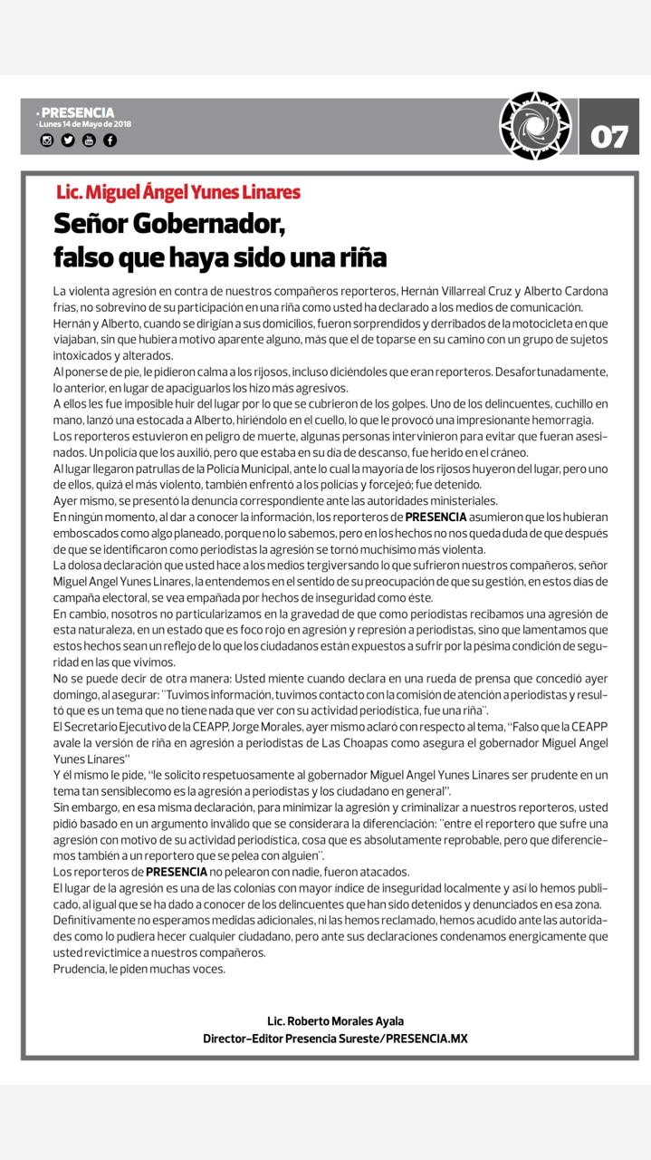 El director de Presencia Sureste y Presencia.MX, Roberto Morales Ayala, pidió al gobernador Miguel Ángel Yunes Linares que rectifique sus declaraciones con respecto a que los reporteros Alberto Cardona Frías y Hernán Villareal participaron en una riña durante la noche del sábado.