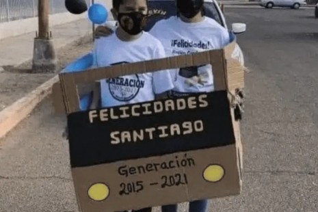 Con carro hecho de cartón, niño participa en caravana de graduación en Poza Rica