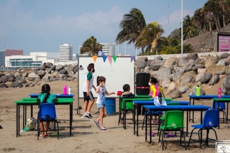 Con sol y sana distancia, escuela privada de Veracruz da clases en la playa