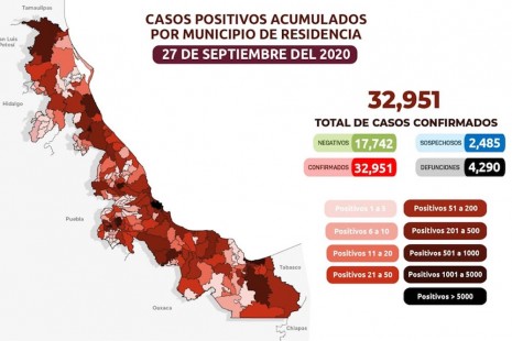 Veracruz acumula 32 mil 951 casos positivos de Covid; hay 4 mil 290 defunciones