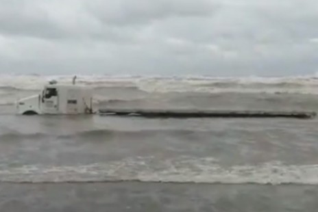 Tráiler termina en el mar en Coatzacoalcos por frente frío
