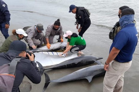 Amanecen delfines encallados en playa de Boca del Río; tres murieron