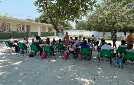 Niños de primaria toman clases bajo un árbol por intensa ola de calor en Veracruz